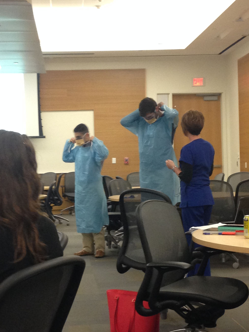 Our next speaker was Mrs. Susan Hartsell who works with infectious disease prevention in GHS. I remember seeing her from Tier I and really enjoyed her talk (especially the little stuffed-toy viruses she brings). Im glad that she covered the Zika virus more in-depth because there's still so much we don't know and new developments keep coming to light and its hard to keep up with what's fact and what's just a rumor on the internet. Listening to her speech also made me a little paranoid for shadowing around the hospital (especially the part about how MRSA is one of the most prevalent diseases) but I'll just keep an eye out for the hand-sanitizers laying around... It was pretty funny to watch Mark and Cameron get dressed and un-dressed as if they were visiting a supposedly ebola-infected patient. I can't believe that it usually takes forty-seven steps to get out of the scrubs in real life!